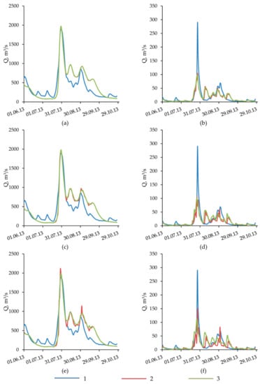 Examples of observed (1) and forecasted (2—with precipitation gradations, 3—with WRF data) runoff hydrographs of 2013 year in gaging stations Ussuri-Kirovskiy (a,c,e) and Krylovka- Krylovka (b,d,f) with lead time at 1, 2 and 3 days, accordingly.