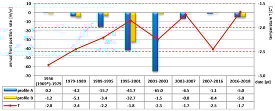- The highest recession rate observed for the northern tongue, when the ice cliff was flowing to the proglacial lagoon in the period 2001–2003, reached 65 m/year. In contrast, the recession rate for the southern tongue terminating on land was 1.5 m/year in the same period. The different reaction of both tongues during the same climate conditions suggests that warm water in the proglacial lagoon, reaching 5.0–5.5 °C, played a significant role in calving and melting processes and caused a retreat of the glacier front;