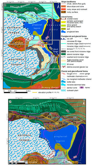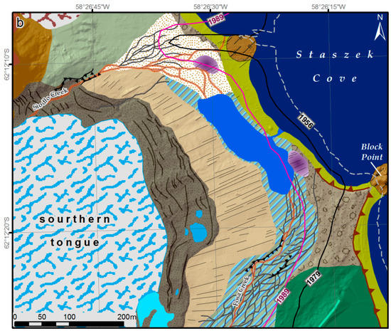 - Kostrzewski, A.; Rachlewicz, G.; Zwolinski, Z. Geomorphological map of the western coast of Admiralty Bay, King George Island. In Relief, Quaternary Paleogeography and Changes of the Polar Environment; Maria Curie-Skłodowska University Press: Lublin, Poland, 1998; pp. 71–77. [Google Scholar]