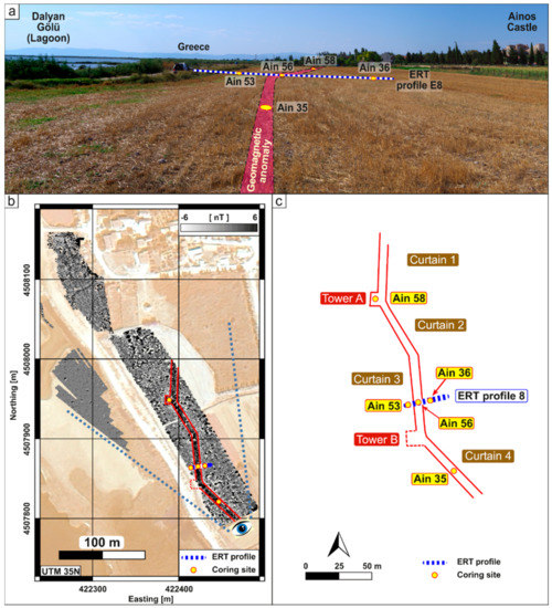 Throughout mankind’s history, the need to secure and protect the home settlement was an essential one. This holds especially true for the city of Ainos (modern Enez) in Turkish Thrace. Due to its continuous settlement history since the 7th/6th century BC, several different types of city walls were built—sometimes even on top of each other—several of which have been preserved over time. To decipher the construction style, the course and the age of a buried city wall segment in the southern part of the former city, a geoscientific multi-proxy approach including magnetic gradiometer (MG) and electrical resistivity tomography (ERT) measurements in combination with granulometrical, sedimentological and microfaunistical investigations on sediment cores was applied. We were able to (1) present reasonable arguments for its Hellenistic age; (2) reveal the course of this wall segment and extrapolate it further north into a less studied area; and (3) demonstrate that in this near-coastal area, the former swampy terrain had been consolidated for constructing the wall. Our multi-proxy approach serves as a valuable example for investigating buried structures in archaeological contexts, avoiding a less-economical, time-consuming, or even forbidden excavation.