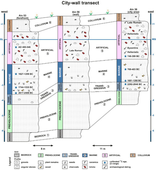 Due to their proximity, the three cores show similar results. The pre-Holocene—most probably fluvial—unit 2 is topped by the transgressive unit 3 that is of similar thickness in all cores. Due to difficulties while coring through the massive unit 5, unit 3 is positioned circa 0.5 m lower in Ain 53 compared to Ain 56 and Ain 36. Consequently, the marine transgression hit the shores roughly during the first half of the 3rd millenium BC. The establishment of a shallow-marine water body (unit 4) becomes visible in all cores at a similar depth; it can roughly be stated for the beginning of the 2nd millennium BC. Based on Ain 36, the marine influence continued at least until Archaic to Classical times (Ain 36/366F; Table 1; Figure 6). Important in the context of this paper is the transition depth between units 4 and 5 which marks the onset of the human impact: it occurs between 1.62 m (Ain 53) and 1.29 m b.s.l. (Ain 36); above this depth, the human impact is clearly evident (Figure 6). This is additionally backed by the results of Ain 58, cored directly in the MG anomaly of Tower A. Ain 58 is very similar to Ain 53, showing the typical profile with all of the six units. Here, the transition between units 4 and 5 is at a depth of 1.63 m b.s.l.