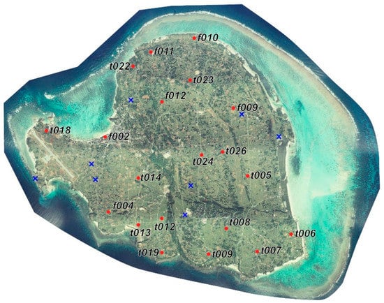 Orthophoto of the Yoron island exhibiting the Ground Control Points (GCP) location (red circle marks) and the assessment point altitudes (blue X marks).