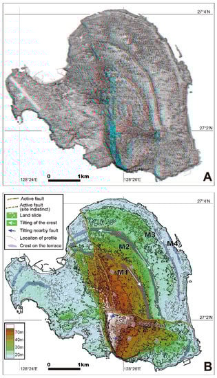 We measured the crest height using the DSM and aligned this data onto the NW trending axis, which is perpendicular to the general direction of the island shelf (Figure 5A). From this figure, we detected the anticlinal deformation along the crest of the M2 surface, which was the longest and most distinguished ridge, whereas [23] reported only southward tilting. It is possible that we have only observed anticlinal deformation along the southern flank of M1 and M3. The ratio of southward tilting along the M1, M2, and M3 crests are approximately 8‰, 6‰, and 4‰, respectively.