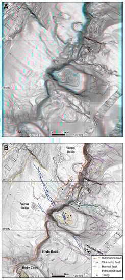 When the topographic anaglyph images are viewed using red-cyan glasses, the topographic relief features can be easily identified [1]. Anaglyphs produced using the digital elevation model (DEM) data are effective to identify the tectonic geomorphic features such as small fault scarps, broad ground deformation, and tilting surfaces [2,3,4]. The analysis and interpretation of topographic anaglyphs along the eastern margin of the Japan Sea and the Japan trench reveal the distribution of active deep submarine faults [5,6]. Nakata et al. (2012) discussed the relation between the tectonic seafloor features and earthquake source faults during the 2011 Tohoku Pacific Ocean earthquake and concluded that active submarine faults were closely related to the earthquake source faults [5].