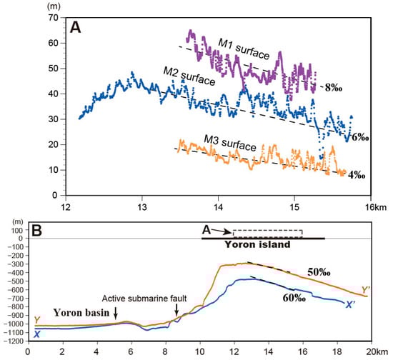 More than 500-m high steep slopes border the Yoron basin toward the east under which we have identified the submarine faults that are bordered by accumulated basin sediments and seismic basement [14]. In this area, the upslope surfaces of the island shelf exhibit a convex shape and are unsymmetrically inclined to the northwest and the southeast sides. The summits of these surfaces are parallel to the steep slope and are located within 5 km from the southeastern edge of the basin (Figure 4). A gentle convex slope to the southeast extends farther than that to the northwest. We observed this slope on topographical profiles across the basin and the island shelf (Figure 5B). This surface’s southeastward tilting ratio is approximately 50–60‰, which is much larger as compared with that of the inland marine terraces.