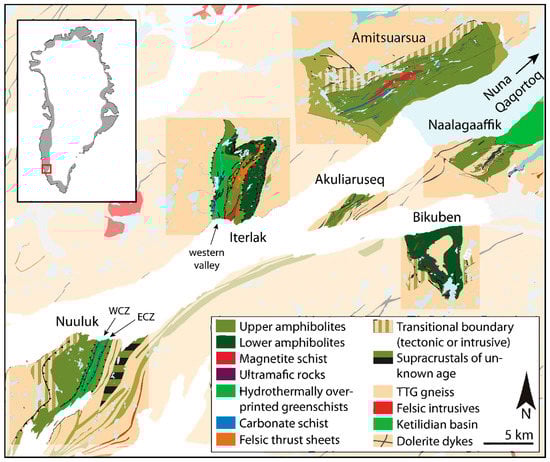 The Tartoq greenstone belt consists of a number of km-sized mafic crustal blocks enclosed by orthogneisses of tonalite–trondhjemite–granodiorite (TTG) affinity on either side of the Sermilligaarsuk fjord in southwest Greenland (Figure 1) [1,2]. The Tartoq belt is part of the North Atlantic craton and is located on its southern margin [3]. A Palaeoproterozoic (Ketilidian-age) basin overlays the Tartoq belt in the east [4]. The main blocks are, from west to east, Nuuluk, Iterlak, Amitsuarsua, Bikuben, Akuliaruseq, Naalagaaffik, and Nuna Qaqortoq (in earlier works, these blocks are also referred to as Nuluk, Iterdlak, Midternæs North, Sioralik, Midternæs West, Midternæs East, and Nuna Qaqertoq, respectively). The blocks represent a disaggregated greenstone belt and expose different crustal levels of this original belt. The various blocks cannot be reassembled and thrusting and folding of the lithologies means that the stratigraphy of the belt is repeated within the blocks, and likely among them (see also [1]). Boundaries with the enclosing TTG orthogneisses are either tectonic (e.g., thrust contacts in Nuuluk and Iterlak) or intrusive (e.g., an intrusive breccia forming the northern boundary on Amitsuarsua and a progressive increase in TTG melt sheets in the southwest of Bikuben). The age of the belt is constrained from cross-cutting felsic melts to be more than 2.9 Ga [5,6], with Lu-Hf whole rock dating of the mafic lithologies giving an errorchron age of approximately 3.2 Ga [6]. Felsic lithologies provide zircon U-Pb ages clustering around 3.0 Ga [7], but these may represent the age of the enclosing TTGs (see below and [2]).