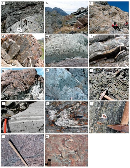 - Kisters, A.F.M.; van Hinsberg, V.J.; Szilas, K. Geology of an Archaean accretionary complex—The structural record of burial and return flow in the Tartoq Group of South West Greenland. Precambrian Res. 2012, 220–221, 107–122. [Google Scholar] [CrossRef]