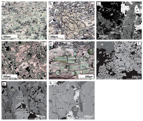 Ultramafic lenses are common in northern and eastern Iterlak and range in size from meters to 100 meters [2,8]. These bodies consist of a core of serpentinite, dominantly composed of antigorite and spinel, enclosed by a talc–magnetite–carbonate rim. The serpentinite core is not always observed. A mono-mineralic actinolite zone is generally present at the contact with the enclosing meta-basalts (Figure 2e). Shear concentrates in the talc schists owing to their low competence and, as a result, the talc schists have been sheared out into thin horizons that can be traced for over 5 km throughout Iterlak (Figure 1), and commonly occur at the base of thrusts (e.g., Figure 2f). Interaction with the enclosing mafic rocks during shearing and thinning produces a rock unit composed of magnetite + quartz ± grunerite, commonly layered or laminated, that has the appearance of a banded iron formation (cf., [10,25]). However, its genetic link with the serpentinites is clear from the close spatial association with talc schists (Figure 2g) and the gradual transition when tracing the unit along strike. During retrogression, Fe-sulfides—both pyrite and pyrrhotite—locally replace magnetite.
