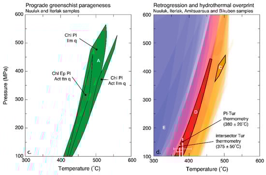 The retrograde greenschists have a typical mineral paragenesis of chlorite + epidote + titanite + quartz + albite + calcite (± apatite, tourmaline, sulfides, and graphite). This same paragenesis is also observed as a retrograde assemblage in amphibolites in all fragments of the Tartoq. The paragenesis is observed in the pseudosections at around 375 °C at 1 kbar to 450 °C at 4.5 kbar (region D in Figure 4d). Tourmaline thermometry overlaps with this band at low pressure. Several of the most intense hydrothermally overprinted samples lack epidote and titanite, and have a mineral assemblage that plots in field E of Figure 4, dominated by chlorite, quartz, carbonates, and rutile suggesting a temperature below 350 °C.
