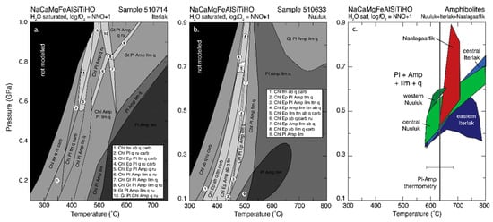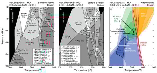Overlaying the pseudosections from rocks with the same paragenesis but different bulk composition constrains paragenesis a to ca. 450 °C at 2 to 6 kbar, b to >550 °C at 3.5 to 7 kbar (Figure 5c and Figure 6c), and d to ~700 °C at 7.5 kbar (Figure 6). Paragenesis c is found at >500 °C at <6 kbar. When MnO is included for the garnet-bearing amphibolite paragenesis, the low-pressure limit shifts down to approximately 7 kbar. The pseudosection constraints are within error of the geothermometry results.