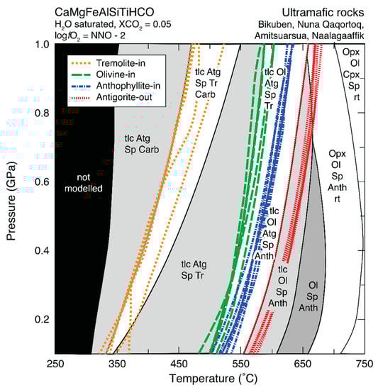 The ultramafic rocks of the Tartoq belt are dominated by antigorite and spinel. Relicts of tremolite, anthophyllite, and olivine are present, and pseudomorphs of antigorite + brucite after olivine are common. Spinel grains are mostly magnetite with a Cr-spinel core. The pseudosections (Figure 7) position the appearance of olivine at between 500 and 580 °C depending on bulk composition and pressure, preceded by tremolite at 350 to 450 °C. The mode of tremolite strongly depends on the Ca content of the ultramafic rock. Anthophyllite comes in at 550 to 600 °C. Locally, domains of tremolite + anthophyllite + spinel are observed in thin sections with antigorite present only as a retrograde replacement along fractures, suggesting the occurrence of a paragenesis without antigorite. The antigorite-out isograd is encountered at 650 °C for the 7 kbar pressure constrained from the enclosing amphibolites (see Figure 6). Moreover, anthophyllite veins were observed in an ultramafic body in Nuna Qaqortoq. This suggests that the antigorite-out isograd has indeed locally been reached. The extensive retrograde overprinting of the ultramafics complicates assessment of their peak metamorphic conditions, but their relic mineralogy suggests conditions in excess of 600 °C. Pressure cannot be constrained from the parageneses.