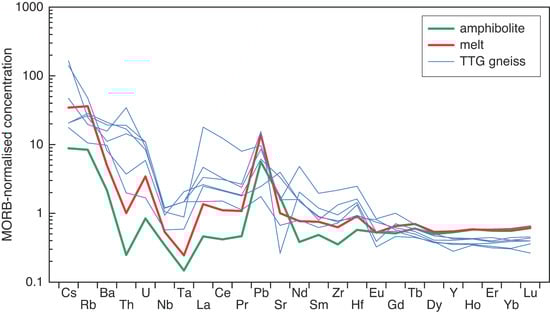 Conditions range from upper-greenschist to lower-granulite facies conditions with development of anatexis at the highest-grade conditions around 750 °C at 7.5 kbar. The low K-content of Tartoq lithologies, and the presence of restitic garnet in the anatectic gneisses results in these partial melts having a TTG-type major element composition. Combining the mineral and melt modes from the pseudosections with mineral-melt trace element partition coefficients for tonalites [36] allows for the trace element signature of the partial melts to be estimated (Figure 9, Supplementary Table S4). The melts show enrichment in incompatible elements and the light over heavy Rare Earth Element (REE) ratio compared to their parent amphibolite. There is reasonable agreement between the mid-ocean ridge basalt (MORB) normalized estimated melt composition and the measured bulk compositions of TTG gneisses enclosing the Tartoq belt (Figure 9). However, the melt REE pattern is at the low end of the range observed in the TTG gneisses, which reflects the low mode of garnet in the restite. The peritectic breakdown of garnet into the melt as observed in Bikuben, and modelled to take place in the pseudosection as the melt fraction increases, will further reduce this signature. We therefore conclude that the TTG gneisses that enclose the Tartoq belt may have formed from partial melting of mafic greenstone belt lithologies, but this must have taken place at higher pressures where garnet is a more abundant restite phase.