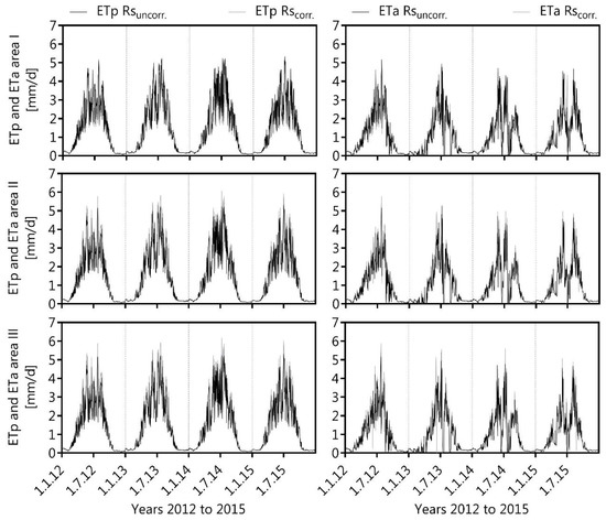 Modeled potential (ETp) and actual evapotranspiration (ETa) with corrected (corr.) and uncorrected (uncorr.) global solar radiation (Rs) between 2012 and 2015 for Areas I, II, and III.