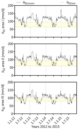 The maximum depth of the evaporative zone was 0.5 m and complied with the part of the recultivation layer (0–0.7 m) in which water content fluctuated relatively intensely during the study period (Figure 3). Area II, with southwest exposure and the highest slope gradients, showed the highest ETa values of up to 5.87 mm/d, but also more pronounced phases during the vegetative period where the θEZ are lower than the wilting point, resulting in higher discrepancies between ETp and ETa of up to 6 (corr.) and 5.3 mm/d (uncorr.).