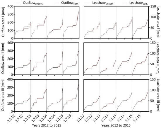 The areas I and III showed the highest discrepancies between cumulative corr. and uncorr. modeled outflow rates of up to 47 mm/year in 2015, while area II showed moderate discrepancies between 9 mm/year and 17 mm/year, with higher total uncorr. outflow rates. The highest differences between cumulative corr. and uncorr. leachate rates were also determined for area III in 2012, with 18 mm/year, while Area II showed the smallest differences, between 0.41 mm/year and 3.5 mm/year (Figure 4).