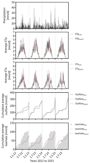 In the period between 2012 and 2015, nearly 59–64% of annual precipitation fell in the hydrological summer period (November 1 to April 30), and 36–41% in the hydrological winter period (May 1 to October 31). In contrast, the more humid years 2014 and 2015, with 753 and 767 mm, respectively, are characterized by approximately equally distributed precipitation rates in the winter period (52–54%) and in the summer period (46–48%). The years 2012 and 2013 showed lower annual precipitation rates, with 655 mm and 669 mm, respectively, compared to the average annual precipitation rate of 752 mm (Figure 5). The winters from 2012 to 2015 were mostly mild and only had some snow. The corr. and uncorr. water balance components enable the comparison between the modeled outflow and the leachate rates with the observed ones.