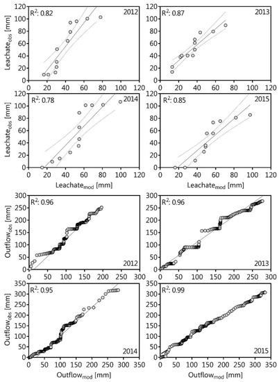 Linear regression analysis of the comparison between observed and simulated leachate and outflow data (dots) for the years 2012 (upper left), 2013 (upper right), 2014 (lower left), and 2015 (lower right). R2 indicates the coefficient of determination, and the dashed lines indicate the confidence limits for a confidence level of 95%.
