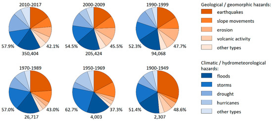 The share of research items focusing on individual types of natural hazards is also relatively stable, with marginal changes being detected since the 1990s (see also Figure 1). The most significant changes in the whole studied period 1900–2017 are the decreasing share of research on earthquakes (from 30.4% in 1900–1949 to 15.7% in 2010–2017) and of research on storms (from 23.1% in 1950–1969 to 12.5% in 2010–2017). The most significant increasing share is observed for droughts (from 6.7% in 1900–1949 to 14.1% in 2010–2017), slope movements (from 2.9% in 1900–1949 to 7.9% in 2010–2017), and other climatic/hydro-meteorological natural hazards (from 3.7% in 1900–1949 to 7.2% in 2010–2017). A very stable share is observed for floods (minimum 17.3% in 1900–1949, maximum 18.3% in 2000–2009).