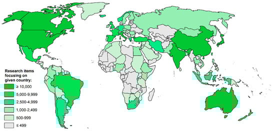 Considering the area of individual countries [25] with more than 1000 research items, it is observed that the highest number of research items per km2 is reached in Taiwan (0.180 research items/km2), followed by Israel (0.066 research items/km2), The Netherlands (0.063 research items/km2), and Switzerland (0.057 research items/km2). Naturally, the lowest number is observed in large countries such as Russia (0.00018 research items/km2), Brazil (0.00083 research items/km2), and Colombia (0.00087 research items/km2).