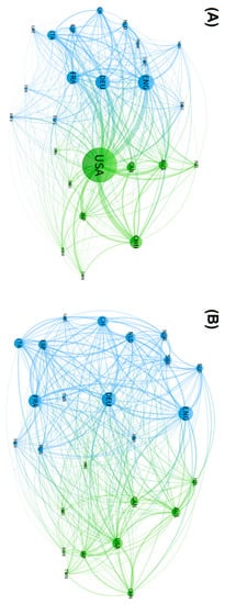 Two clusters of bi-lateral cooperation are identified (see Figure 4)—European (leading countries England, Germany, France, Italy) and circum-Pacific (leading countries USA, China, Canada, Australia, Japan). Considering the amount of joint research items between two countries, the most intense scientific cooperation exists between the USA and China (8642 joint research items), the USA and England (6343 joint research items), and the USA and Canada (5750 joint research items). Additionally, 3000+ joint research items exist between the USA and Germany, the USA and France, the USA and Australia, the USA and Japan, and the USA and Italy.