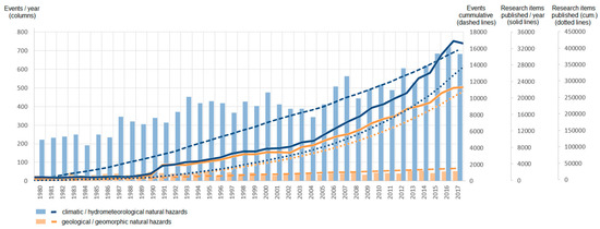 The occurrence of natural hazards based on MunichRE NatCatSERVICE data [1] in the period 1980–2017 indicates an increasing number of reported events (a total of 17,320 events, of which 1532 (8.8%) are classified as geological/geomorphic natural hazards). These figures provide an average of 194 research items published in the WOS database per one geological/geomorphic event in the NatCatSERVICE database and an average of 24 research items published in the WOS database per one climatic/hydro-meteorological event in the NatCatSERVICE database. Specifics of the database building (especially classification scheme and the definition of disasters; see also Section 2.3), however, need to be considered carefully when interpreting these observations (see [22,23]). While the cumulative number of reported events exhibits an increasing linear trend for both climatic/hydro-meteorological and geological/geomorphic natural hazards, a rather exponential trend is observed for the increasing number of research items published (see Figure 5). This exponential trend could be explained as a result of the increasing interest of the research community in natural hazard science (see also the comparison in Section 3.1.1) or as a result of a generally changing publishing paradigm (see also [13]), as well as possible other motivation for research on natural hazards, such as changing strategic natural hazards-/disasters-related policies [29,30] and/or research funding priorities [31,32].