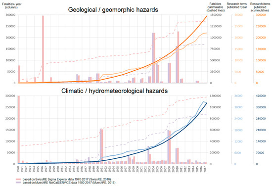 Fatalities caused by natural hazards in both global databases [1,5] significantly vary yearly, reflecting the occurrence of major disasters (e.g., major earthquakes, tsunamis, and floods; see Figure 6). Furthermore, the cumulative number of fatalities caused by natural hazards is increasing with a rather linear trend interrupted by episodic imprints of major disasters, such as the 2004 Indian Ocean earthquake and tsunami, or the 2010 Haiti earthquake. A total of 1,723,648 fatalities are attributed to disasters in the period 1980–2017 (of which 848,437, i.e., 49.2% to geological/geomorphic ones [1]). A total of 2,530,566 fatalities are observed for the period 1970–2017 (of which 1,356,146; i.e., 53.6% are attributed to geological/geomorphic hazards [5]). Some of the major disasters are also recognizable in research on natural hazards, clearly not only motivated by the number of fatalities caused. An example is again the 2004 disaster, which led to the increase of research items on tsunamis, from 154 research items published in 2004 to 624 research items published in 2005 (+305%).