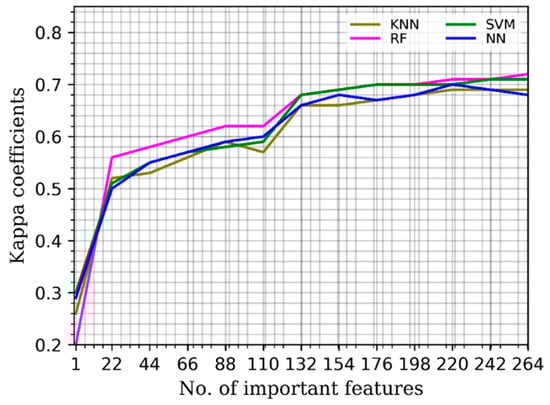 The variation of the kappa coefficient by increasing the important number of features obtained from the cross-validation method is shown in Figure 1. The kappa coefficients increased by increasing the number of important features up to a point, after which they started to saturate for all of the classifiers.