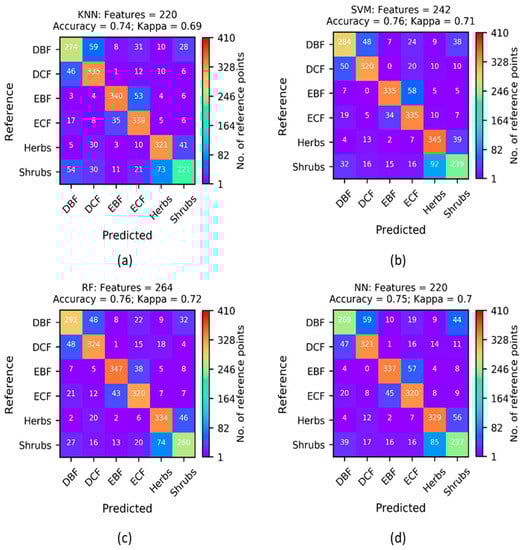 Confusion matrices computed with the optimum set of features using four different classifiers: (a) k-Nearest Neighbors (KNN), (b) Support Vector Machines (SVM), (c) Random Forests (RF), and (d) Multilayer Perceptron Neural Networks (NN). Abbreviations: evergreen coniferous forest (ECF), evergreen broadleaf forest (EBF), deciduous coniferous forest (DCF), deciduous broadleaf forest (DBF), shrubs (Sh), and herbaceous (Hb).
