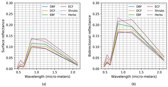 Spectral profiles using annual minimum values: (a) MOD09A1/MOY09A1 product-based surface reflectance, (b) MCD43A1 product-based isotropic (SZA = 0°, VZA = 0°, RAA = 0°) reflectance.