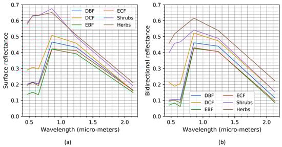 Spectral profiles using annual maximum values: (a) MOD09A1/MOY09A1 product-based surface reflectance, (b) MCD43A1 product-based isotropic (SZA = 0°, VZA = 0°, RAA = 0°) reflectance.