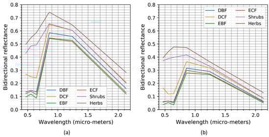 Figure 5 shows the spectral profiles in the backward and forward scattering directions. The herbs, shrubs, and deciduous conifer forests showed higher backward scattering in the red region than the deciduous broadleaf, evergreen broadleaf, and evergreen conifer forests. It may be because the exposure of ground surface is more pronounced in the case of short and deciduous vegetation (herbs, shrubs, and deciduous forests) while viewing from the off-nadir directions. Moreover, the forward reflectance data are much lower than the backward reflectance, which was possibly due to the presence of shadows in the forward direction. Thus, the analyses with the spectral profiles indicated that bidirectional reflectance data provides additional features for improving the classification and characterization of vegetation physiognomic types.