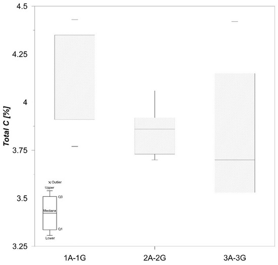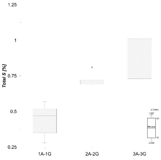 Total C content in the samples studied varies from 3.40% to 4.43% (Figure 5), and total S concentrations are quite low (0.28–1.08%) (Figure 6), which is in accordance with Faganeli et al. [22].
