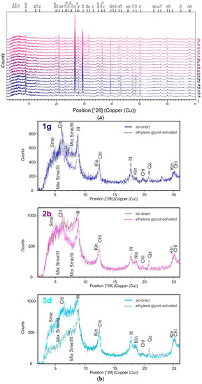 Figure 7. (a) XRD diagram of Koper Bay sediments studied; the uppercase letters describe the mineral composition of the samples. (b) XRD diagrams of samples-oriented preparation; abbrevations: Sme (smectite), Chl (chlorite), Ill (illite), Klh (kaolinite), Qz (quartz).