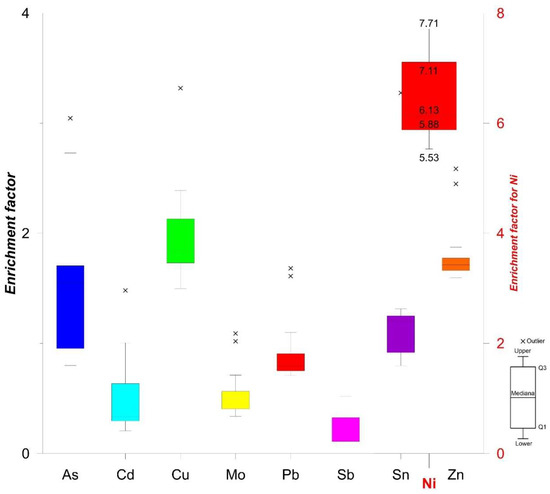 Figure 8. Candlestick chart of enrichment factor (EF) values for investigated heavy metals.