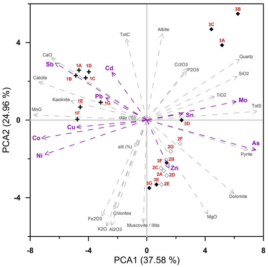 PCA (Figure 9) accounted for 62.5% of data variance in the first two ordination axes, revealing highly significant positive correlations in samples from location 1 between Sb, Pb, Cd, Cu, and Ni present in clay fractions. These heavy metals are generally incorporated into kaolinite lattice and fine carbonate mud with low content of organic matter. Samples from locations 2 and 3 showed elevated concentrations of Zn, As, pyrite, and dolomite. As is closely related to pyrite mineral. Samples 3a, 3b, and 3c displayed elevated values of Mo and Sn due to increased TBT (tributyl tin) sources. Quartz, plagioclase, chlorite, and muscovite/illite originated from flysch geological background. Fe, K, and Al were found in the silt fraction, which is prevailing in location 3.