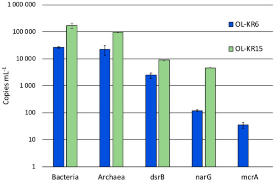 The cell numbers in OL-KR6/125–130 m and OL-KR15/446–460 m fracture fluids were 3.8 × 104 and 4.0 × 104 cells mL−1, respectively, based on DAPI staining before the six-week incubation. The number of bacterial and archaeal 16S rRNA genes were higher in OL-KR15 fracture fluid (0.9–1.7 × 105 copies mL−1) than in OL-KR6 water (2.2–2.4 × 104 copies mL−1) (Figure 1). Sulphate reducer (dsrB) and especially nitrate reducer (narG) gene copy amounts were also higher in OL-KR15 than in OL-KR6 water. In contrast, methanogen (mcrA) genes were detected in the OL-KR6 fracture fluid, but not in the OL-KR15 water.