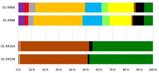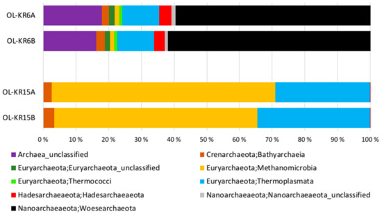 The number of sequence reads obtained from the two fracture fluid samples varied between 5608 and 16,958 for bacteria, and from 13,513 to 16,827 for archaea (Table 3). Compared to the actual numbers of observed operational taxonomic units (OTUs), on average, 55.7% and 61.2% of the Chao1 estimated numbers of bacterial OTUs were detected from OL-KR6 and from OL-KR15 fracture fluids normalised data, respectively. For archaea, the average OTU coverage was 69.4% and 72.9% from OL-KR6 and from OL-KR15 fracture fluids, respectively, and thus, higher for archaea than for bacteria in both samples. The Shannon diversity index H′ was higher in OL-KR6 water for both the bacterial and archaeal communities, compared to OL-KR15 (Table 3). Furthermore, H’ for the bacterial communities was higher than the archaeal H′ in both fracture fluids. From the bacterial sequences, altogether 35 different phyla and candidate phyla were detected from OL-KR6 and OL-KR15 combined, while the archaeal communities contained a total of nine phyla and candidate phyla. Of these phyla, only six bacterial and four archaeal ones were represented by more than 1% of the sequences in either sample (Figure 2 and Figure 3). The share of unclassified bacterial and archaeal sequences was 4.3% and 16.8% in the OL-KR6 sample, and less than 0.3% for both bacteria and archaea in OL-KR15 fracture fluid.