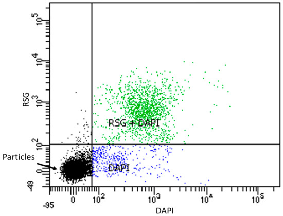 Scatter plot of RSG and DAPI stained starved OL-KR6/125–130 m fracture fluid. 10,000 events were measured with flow cytometry: black dots are particles, blue dots are cells stained with DAPI and green dots are cells stained with both DAPI and RSG.
