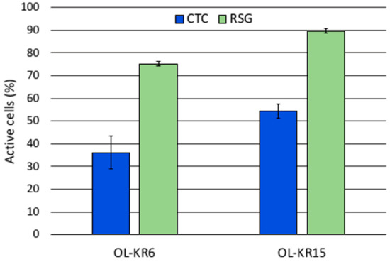 Share of fluorescent cells in the six-weeks incubated groundwaters of OL-KR6/125–130 m and OL-KR15/446–460 m with CTC (5-Cyano-2,3-ditolyl tetrazolium chloride) and RSG (RedoxSensor Green) redox sensing fluorescent dyes from the DAPI (4′,6 diamidino-2-phenylindole) stained cells.