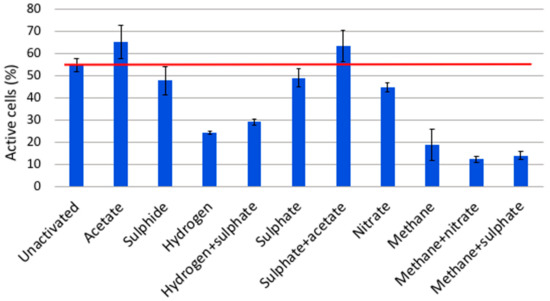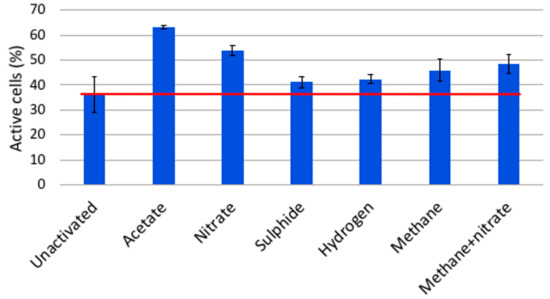 The microbial community of the OL-KR6 fracture fluid was activated with all tested electron donor and acceptor additions (Figure 6). Acetate and nitrate had the highest activation effect on the microbial cells. It is likely that acetate notably activated sulphate reducers (SRBs), that probably suffered from electron donor shortage due to the preceding six-week incubation. SRBs were abundantly detected from the original groundwater in the qPCR assay (Figure 1). Nitrate seemed to be quite effectively used as an electron acceptor, and nitrate reductase (narG) genes were also detected in the original groundwater with qPCR. Methane was an average activator, and possibly activated methanotrophs. Nitrate addition, together with methane, increased the amounts of activated cells, although methane addition may have inhibited the activation level of microbes that might have been activated by nitrate addition alone. However, the difference in the activation capacity between nitrate and nitrate together with methane remained within the standard deviations. Sulphide and hydrogen were the least effective activators. OL-KR6 fracture water contained a lot of putative sulphur oxidisers, as an abundant part of the bacterial sequences belonged to Epsilonproteobacteria, and more specifically, to Sulfurimonas spp. (33%). However, sulphide activated only a minor part of the community, and a shortage of suitable electron acceptors was possibly a limiting factor. For the low activation effect by hydrogen, the reason may be that there was no carbon dioxide available, and thus, hydrogenotrophic methanogens and autotrophic SRB could not be activated. It is also likely that hydrogen was not the first choice as an electron donor for sulphate reductions by the SRB, and at least some detected groups are known to utilise acetate, especially in the Desulfobacteraceae [34] and Desulfarculaceae [35] families. Overall, it should also be noted that one third of the community was already active before the addition of substrates, and these electron donor and acceptor additions only targeted cells that were not already actively taking up the CTC stain.