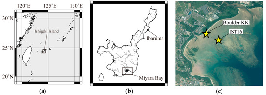 - Sato, T.; Nakamura, N.; Goto, K.; Kumagai, Y.; Nagahama, H.; Minoura, K. Paleomagnetism reveals the emplacement age of tsunamigenic coral boulders on Ishigaki Island, Japan. Geology 2014, 42, 603–606. [Google Scholar] [CrossRef]