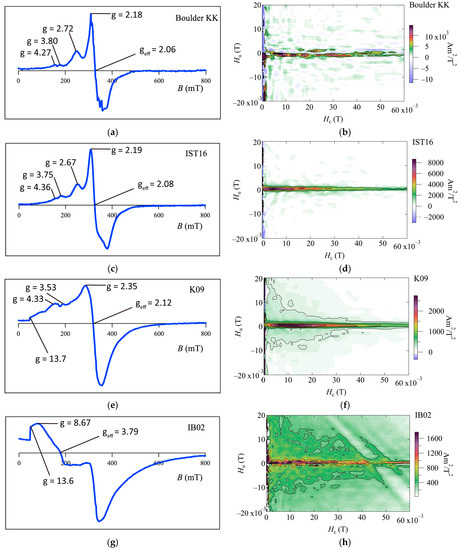 FMR derivative spectra and FORC diagrams of coral boulders on Ishigaki Island; (a,b) Boulder KK; (c,d) IST 16; (e,f) K09; and (g,h) IB02.