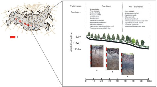 Dark, coniferous hemiboreal forests (Milio effusi—Abietetea sibiricae) [,] are common in the southern taiga subzone within the West Siberian Plain, where they grow on automorphic, texturally differentiated, and semihydromorphic organic matter accumulating soils that often have residual humus horizons [,,]. Such forests are spread throughout the Holocene forest-steppe ecotone, and dynamic changes in the geographic environment of the ecotone in the past have resulted in the complex and contrasting evolution of its soils and soil cover. In the mid-Holocene, the soils of the forest-steppe ecotone underwent the dark-humus stage of soil formation, which was later succeeded by the active textural differentiation of automorphic soils and the hydrogenic transformation of soils on the margins of the increasing mires. Due to all these processes, mineral soils of the region display polygenetic features, recorded in the complex structure of their organic matter profiles. These include high humus content, differences in humus quality between the contemporary and the second humus horizons, occurrence of molecasts, residual solonetz, carbonates, and solodic features.