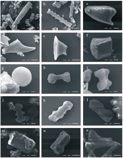 Micrographs of the phytolith types considered for this study: (a,b)—Elongate; (c)—Carinate lanceolate; (d)—Carinate conical; (e)—Rondel; (f)—Bulliform cuneiform; (g)—Globular psilate; (h,i)—Bilobate; (j–l)—Trapiziform polybate; (m,n)—Cubic scrobiculate; (o)—Acicular hair cell.