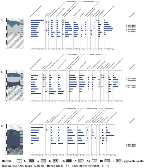 Soil phytolith profiles (percentage of the total content). Soils: (A)—Endocalcic Stagnic Albic Luvisols (Siltic, Abruptic, Cutanic, Epiloamic) on the hilltop; (B)—Endocalcic Stagnic Albic Luvisols (Siltic, Abruptic, Cutanic, Epiloamic) on the midslope; and (C)—Calcic Stagnic Greyzemic Epidystric Umbrisols (Siltic) on the toeslope.