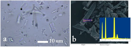 Images of phytoliths extracted from soils: (a)—Optical microscopy images of phytoliths; (b)—SEM image of phytoliths with EDS analysis of phytolith surface.