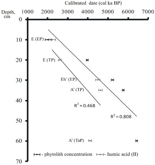 The sample, collected from the lower boundary of the A’ horizon within Calcic Stagnic Greyzemic Epidystric Umbrisols had PhytOC dated as 6404–6466 cal year BP (median 6435 year cal BP) and humic acid dated as 4051–4185 cal year BP (median 4118 year cal BP) (Figure 5). The difference between the dates exceeded 2300 year and most likely results from the different rates of organic carbon rejuvenation in the soil and PhytOC. The carbon contained in different humic acid fractions, which is the most resistant fraction in HAII under increased biochemical activity and lessivage, is rejuvenated, thus decreasing the radiocarbon dates []; conversely, the carbon occluded in phytoliths is preserved, since it is subject to a much less aggressively destructive soil-forming environment.