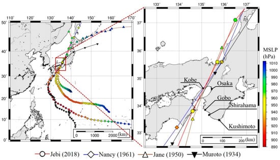Most notable storm tracks to affect Osaka Bay area. Best track data for Jebi and Nancy are from Japan Meteorological Agency (JMA) [1,2], while Jane and Muroto’s are from NOAA’s IBTrACs database [3]. Note that there is no pressure information for Muroto’s track data.