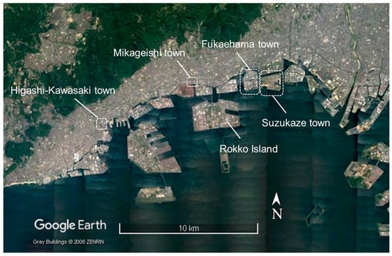 Fukaehama town is also located at Higashinada ward, east of Mikageishi town, with the reclaimed land next to the coast being mainly dedicated to industrial use. The area is protected by an approximately T.P. +5.4 m high dike [15] (Figure 7a).
