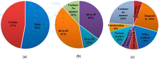 Distribution of respondents; (a) Gender distribution of respondents (n = 17); (b) Age distribution of respondents (n = 17); (c) Occupation of respondents (n = 17).